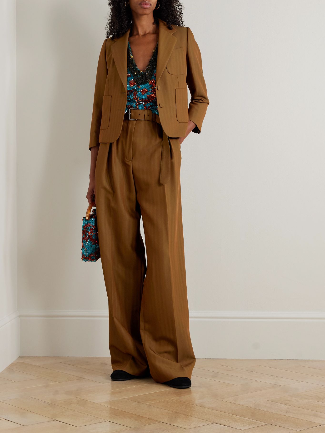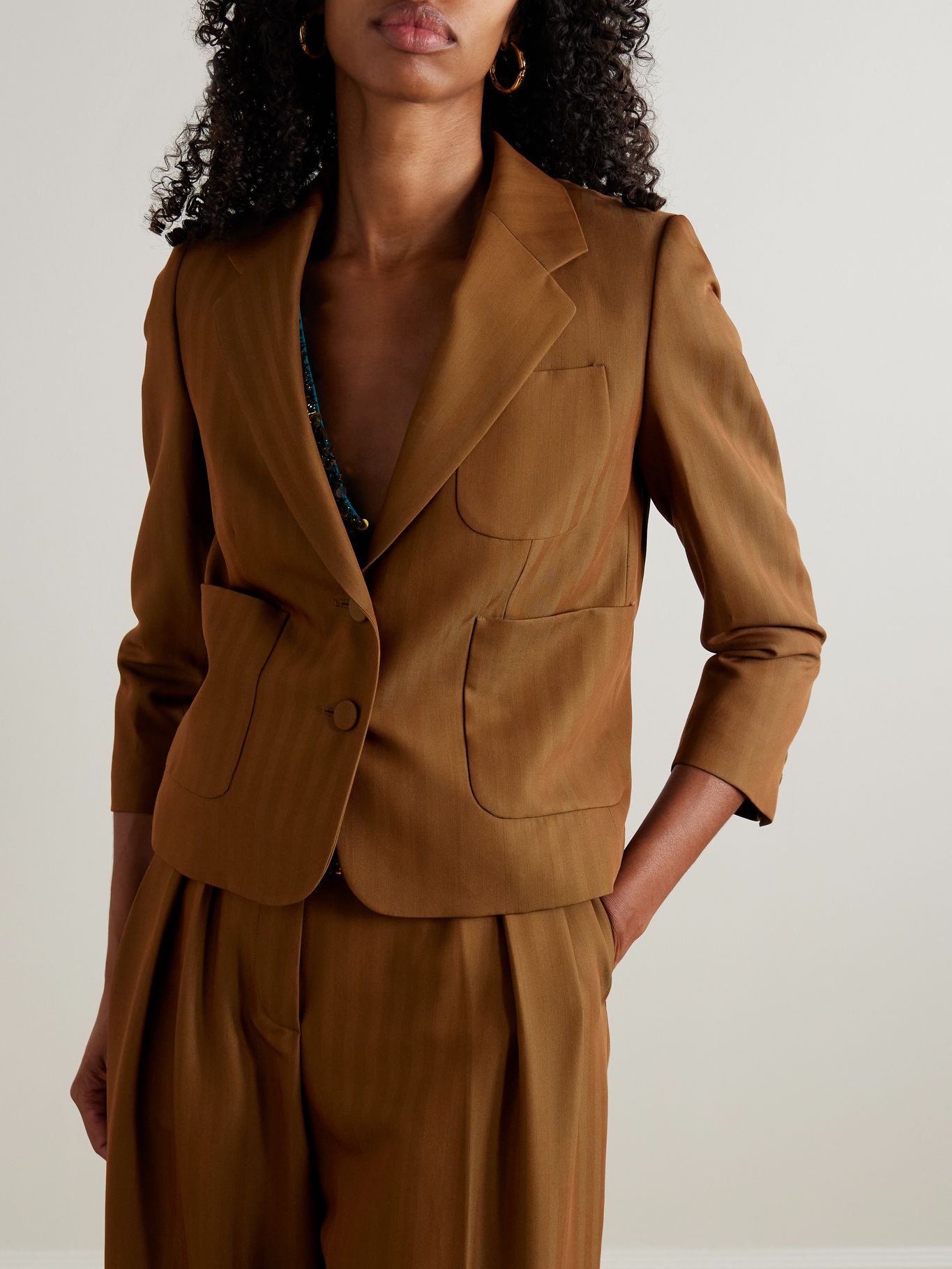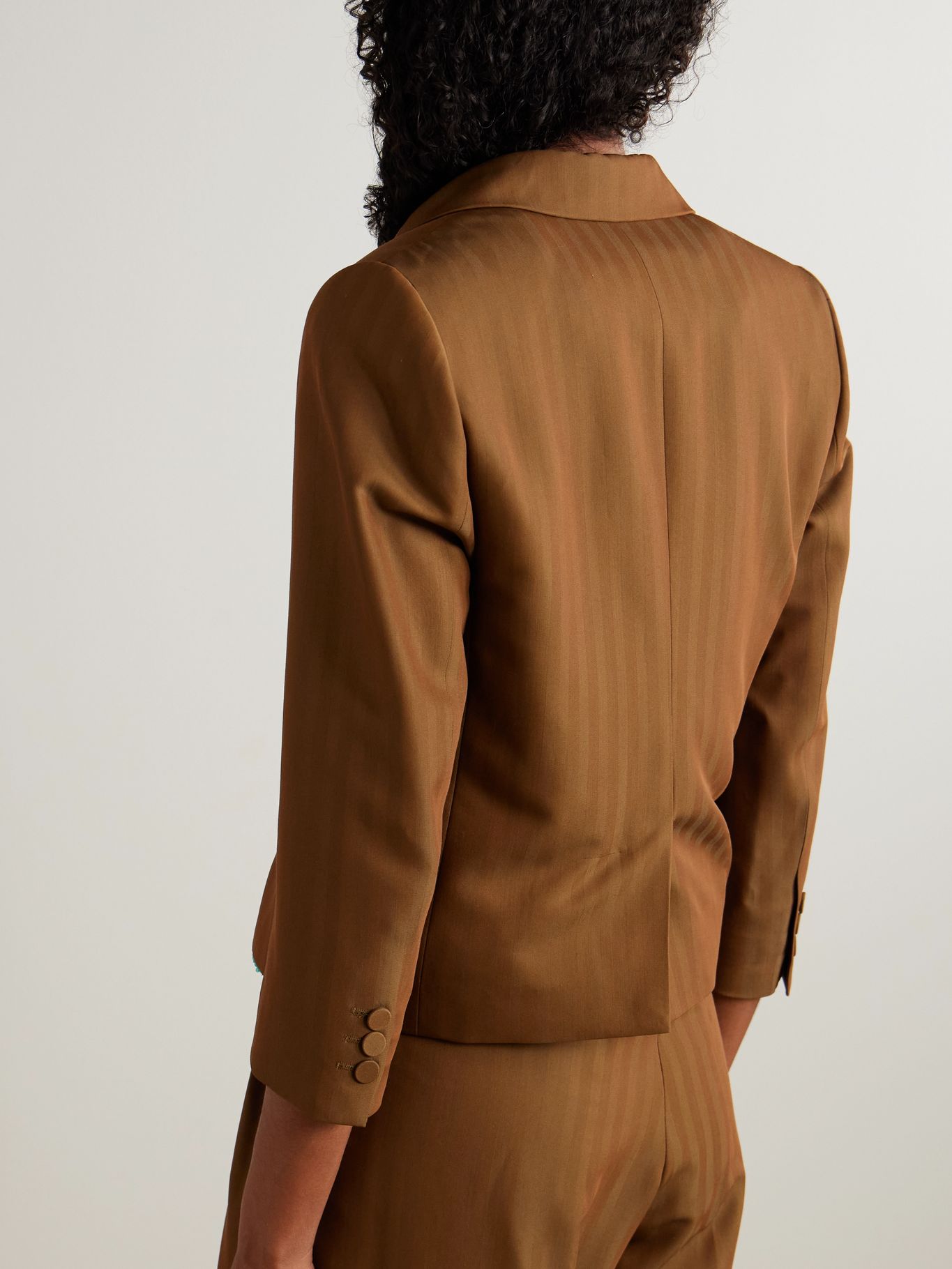 Calvin Vest được dệt với những sọc ánh iridescent khẽ bắt sáng tinh tế. Thiết kế được may đo từ chất liệu wool-blend twill, với phom dáng ôm gọn và chiều dài lửng trong tông camel linh hoạt, dễ phối. Lớp lót satin bên trong giúp dễ dàng phối nhiều lớp trang phục.
